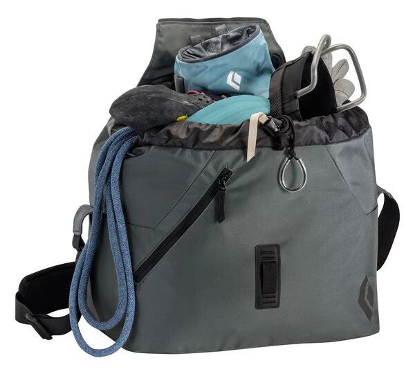 The Black Diamond Gym Solution 30 is the receptacle for your cord, shoes, harness and belay glasses, the answer for days in the gym. An elastic pocket keeps your gear separate from your cord, while a zippered pocket keeps important essentials locked down. A one-handed open system speeds up your session, and the padded shoulder strap is comfortable and easy. The “repo” or “assorted” color is built from repurposed fabric scraps from our sewing factory and comes in assorted colors.