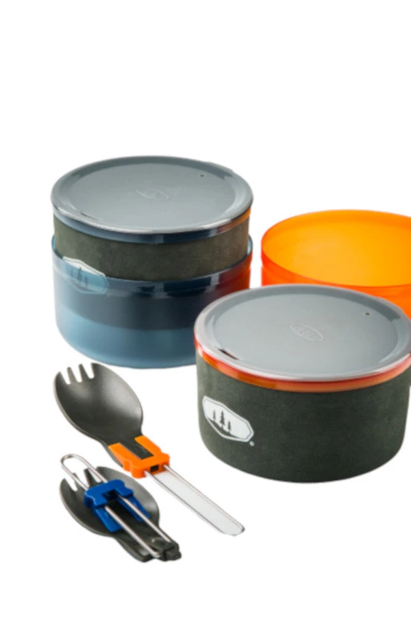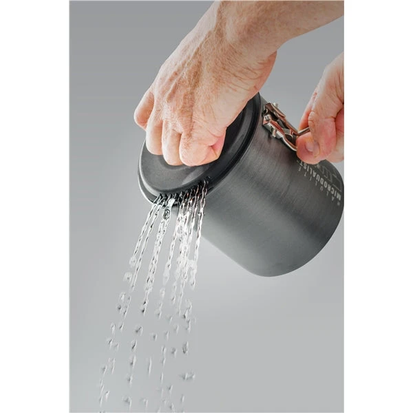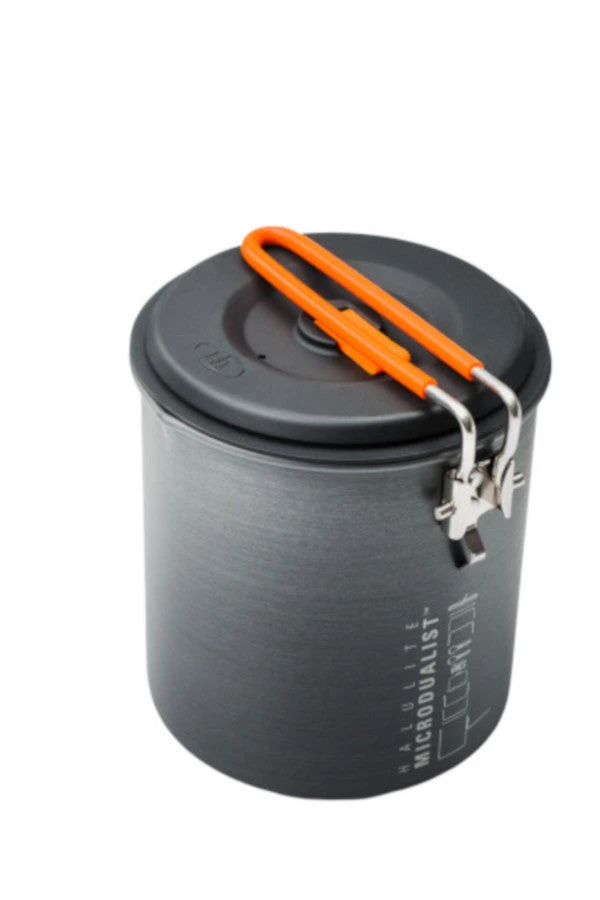 Halulite Microdualist II Cookset integrates everything you need for cooking and eating when backpacking to the extreme. Efficient and ultra-light hard-anodized camping cookware set integrates secure, heat-resistant Nylon 6-6 strainer lid, two Folding spoon, two insulated mugs with sip-it tops and nesting bowls, and a hard anodized 1.5 qt (1.4 liter) pot with stamped in graduations making it easy to measure. Waterproof storage bag also serves as sink in one compact, nested package with room to store a Pinnacle Canister Stove and 110 g fuel canister.