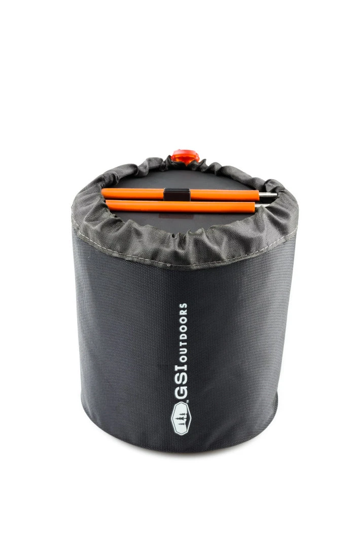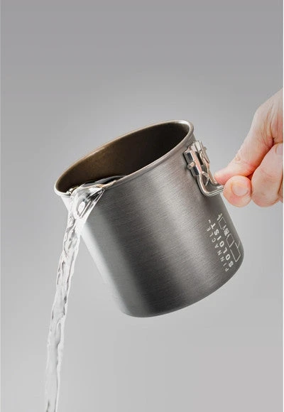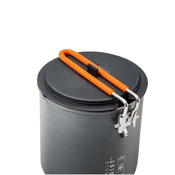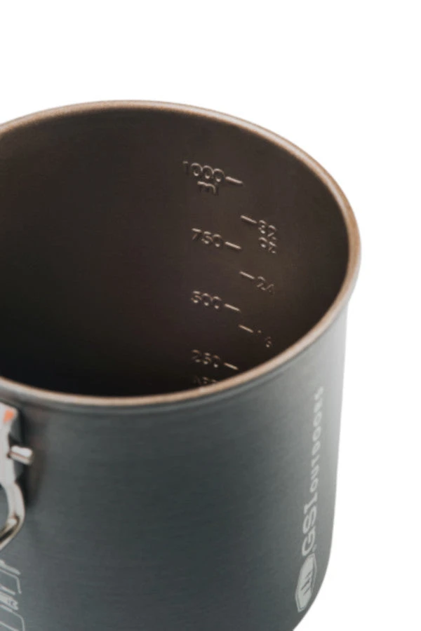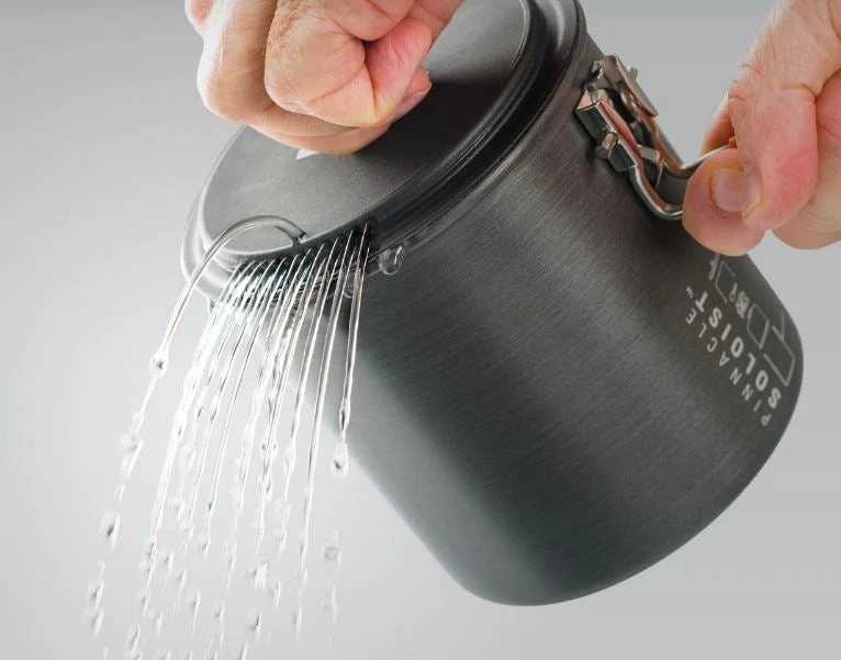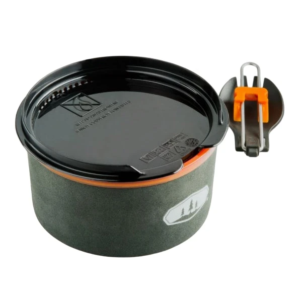 Efficient and ultra-light hard anodized camping cookware set integrates a secure, heat-resistant Nylon 6-6 strainer lid, Folding Foon, insulated mug/bowl, a hard anodized Telfon with Radiance Technology-non-stick-coated 1.2 qt (1.1 liter) pot. Waterproof storage bag that also serves as sink in one compact, nested package with room to store a Pinnacle Canister Stove and 230 g fuel canister.