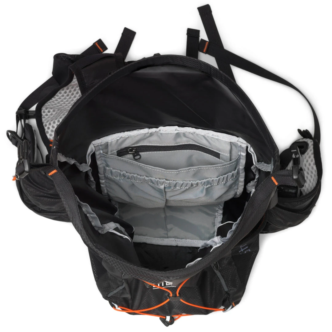 - Prepared for headlamp integration- cable outlets, battery compartmentEasy access pockets- no need to stop to get your gear- 2x mesh pocketsonc chest for soft flask(500 ml, Art. no: 37996 – not included)- 2x zippered pockets on belt for phone, gloves, beanie, gels and bars- 2x mesh pockets on side for jacket, beanie and glovesInner compartment- 1x large compartment- 1x medium pocket with reservoir hanger- 1x small, zippered pouch (ideal for headlamp battery)- 2x cable outlet for headlamp battery