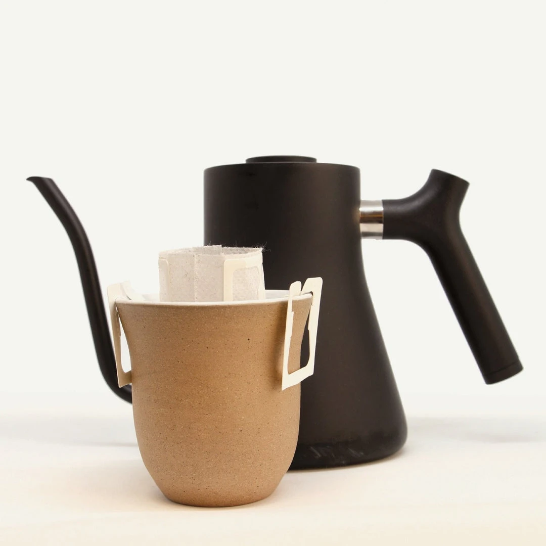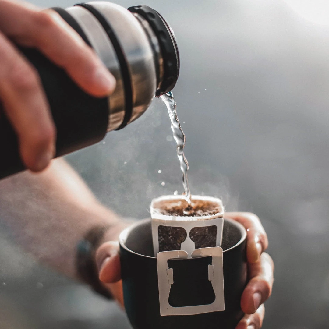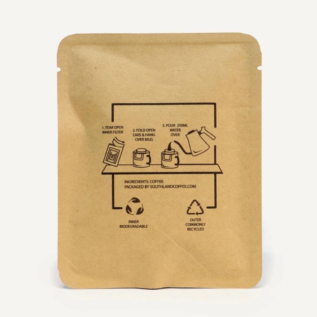 A box of 10 individually packaged pour-over filters, pre-filled with a single origin Guatemalan coffee.